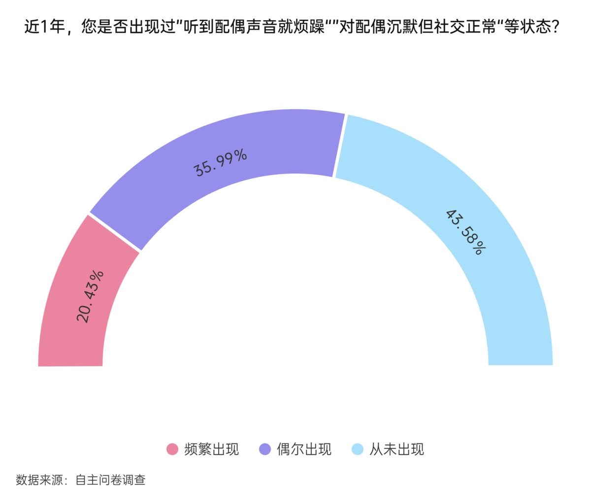 长期的情感疏离与压抑,没有配偶提供的良好情绪价值牵动身体多处激素的分泌,会影响人的身心健康与精神状态。卒婚状态下的人们往往会出现烦躁、内耗、焦虑反应。问卷数据显示,56.42%的受访者出现“听到配偶声音烦躁”“对配偶沉默但社交正常”的反应,甚至部分对配偶声音产生生理性头痛。